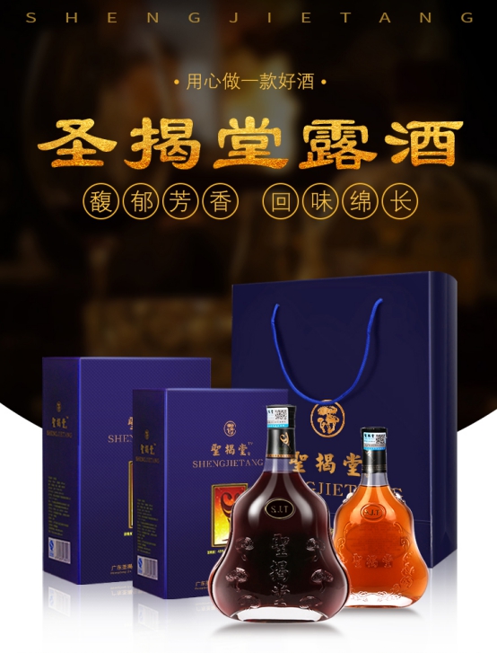 圣揭堂露酒以优质大米酒为基酒,配合各种中草药材为原料,结合蒸馏酒、肉桂、桑椹、槐花等配方,采用民间秘方酿造技术的基础上配以秘制酒曲,成功制造的“圣揭堂”露酒具有一定的神奇效果价值,针对腰酸背痛、关节疼痛方面有很好的保健。