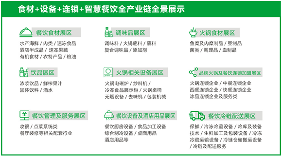 本届展会规模升级,60000㎡展示面积,设置5大展馆,9大展区,2000多家参展企业,展示餐饮食材、调味品、火锅食材及用品、餐饮设备及酒店用品、咖啡饮品、连锁加盟、冷链物流等相关的万款产品。同时特设餐饮冷链配送展区、餐饮食材加工与包装展区。展区主题不断丰富,展品覆盖餐饮全产业链。