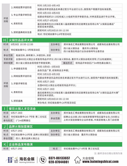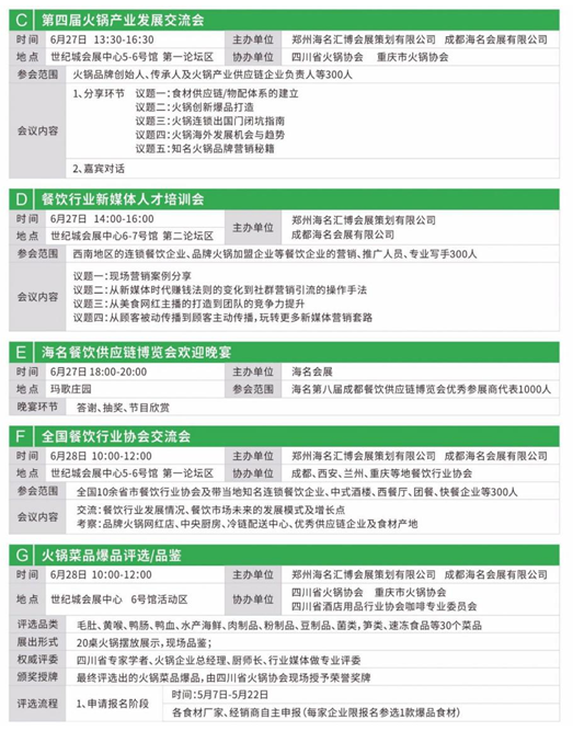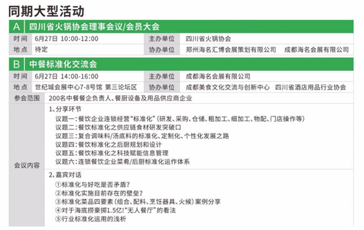 同期将围绕餐饮行业发展、中餐标准化、火锅、人才交流、新媒体营销等热点话题,举办十余场行业论坛、交流会、赛事活动。聚焦餐饮业发展中的热点、痛点和难点,共同探索餐饮行业在新的发展形势下,上下游产业链如何协作,突破企业增长困境,探讨未来新可能!