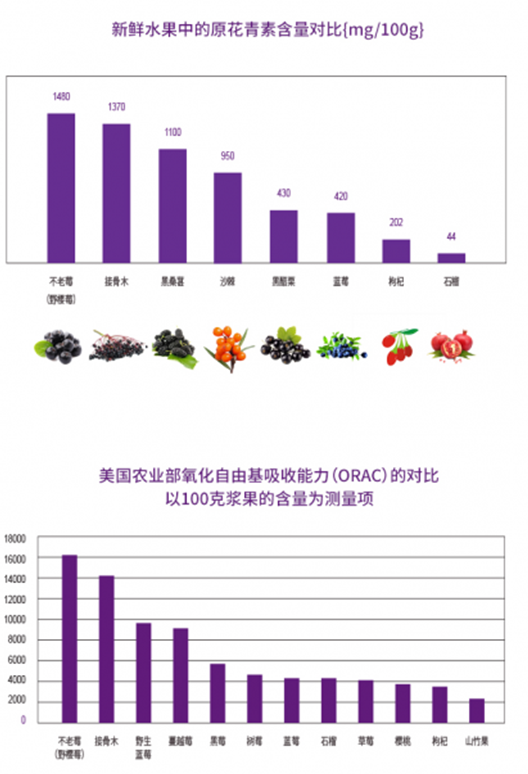 或许好多人都听过花青素,如蓝莓、蔓越莓、枸杞等,它们只所以大受欢迎,是因为含有对人体十分有益的花青素、多酚等成分,但拥有“莓王”之称的不老莓却常常被忽略,可是你知道吗?不老莓所富含的花青素、多酚等成分是现有新鲜水果中含量最高的,美国农业部(USDA)资料显示:100g不老莓所含的花青素为1480mg, 约是红酒的2000倍,野生蓝莓的4-5倍,多酚含量是葡萄的80倍,覆盆子的20倍,蔓越莓的13倍。 在所有的莓类水果中,不老莓ORAC抗氧化指数远居第一位。