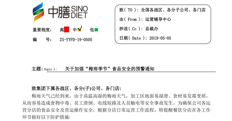 中膳集团总部食安中心开展不定期检查,对门店的食安漏洞进行及时提升。抽检内容涵盖人员管理、制度管理、采购制度及索证索票、食品保存、初加工及切配管理、烹调加工环节、专间管理、留样、食品运输及售卖、餐厨垃圾及废弃油脂处理、虫害管理等环节,做到全方位检查。针对所检查出来的问题,要求门店提交整改报告,以最快的速度进行改正。