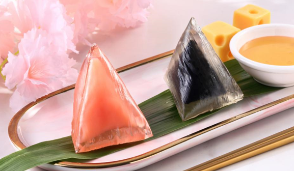 爽滑细腻的流沙内馅被高温蒸煮形成的木薯粉透明外皮围绕,在外层包裹的箬叶清甜淡香,口感层次分明。微甜恰好的浪漫樱花味,每一口都是粉粉的少女心;清新香醇的海盐芝士味,是芝士控的福音。两种口味,可盐可甜,完美解决了困扰南北方人民多年的“咸甜之战”。