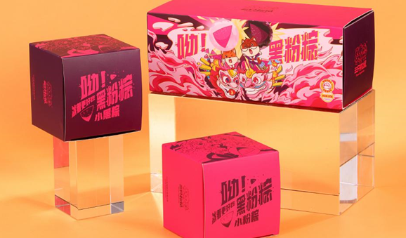 以粉色为主的外包装完美契合了时尚潮流色,成为这个夏日里最为亮眼的存在。内里又包含了两小盒,分别是符合产品色调的黑色和粉色,因此这款粽子被取名为“黑粉粽”,包装盒上图文简单粗暴,让整个产品透出一种时尚气息。
