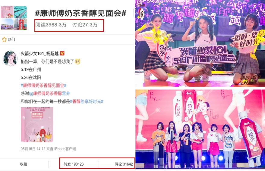 近日,康师傅奶茶联手火箭少女101杨超越、段奥娟、傅菁在广州、沈阳两地接连举办粉丝见面会,为粉丝们创造了一个近距离接触偶像的机会。见面会现场人声鼎沸,燃情四射,粉丝们纷纷为小姐姐们呐喊欢呼,台上台下互动频繁。康师傅奶茶作为此次活动主办方,最大限度获得了曝光,不仅收获了粉丝流量,更将自己年轻化的形象深入人心,相关话题阅读量近4千万,超27万人参与讨论,仅杨超越个人一条微博,转评已超20万。这些数据的背后,是康师傅奶茶对于代言人选择的战略考量,更是占领年轻消费者心智的策略布局。杨超越作为近年来现象级的话题人物,自身就携带了巨大的话题流量;同时康师傅奶茶与火箭少女101的不断捆绑出现,也使康师傅奶茶活力青春的年轻化形象逐渐深入人心。