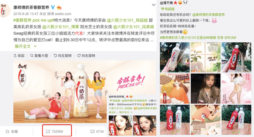 康师傅奶茶之所以能在此时脱颖而出,与它携手火箭少女101的选择息息相关。《创造101》引发全民关注,火箭少女101横空出道,去年8月康师傅奶茶就趁热打铁与火箭少女101杨超越、段奥娟、傅菁三人签约,分别对应3款康师傅奶茶产品,单条官宣微博就获得了超15万的转发,成功借势IP流量。浏览康师傅奶茶官微日常发布内容,也大多和代言人动态有关,康师傅奶茶“小醇”成为代言人迷妹,实力追星获得众多粉丝的互动,同时线下购买晒图等活动也获得了粉丝们的积极响应。