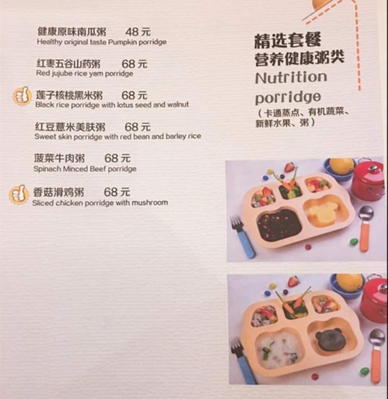 在嘉和一品粥餐厅,笔者看到店内推出的儿童套餐,包括一碗南瓜粥、一个酱肉包、一个小熊形状的豆沙包、一个烤翅,用卡通托盘盛起来。食物配料表中标示了调味料的使用:南瓜粥内有冰糖,豆沙包里有红豆馅和糖,酱肉包内有甜面酱和其他调味料。儿童套餐内的餐品在其他套餐中也有售,不过量较大。有消费者认为,这样的儿童套餐实质上是小份配餐,在食材和调味品的添加上与普通餐品无异。