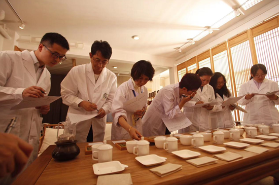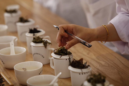 专家评委们通过看干茶、茶汤、叶底、品滋味等程序,与大众评委一道完成了数十款茶样的赏鉴品评工作。