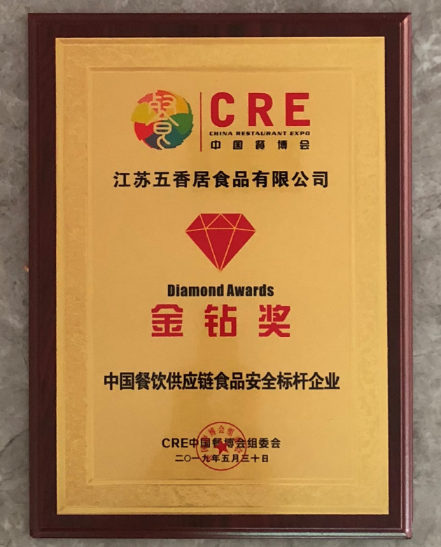 5月30日,江苏五香居食品有限公司又获殊荣,获评由中国酒店餐饮业博览会(简称CRE中国餐博会)颁发认证的“中国餐饮供应链食品安全标杆企业”并拿下金钻奖。CRE中国餐博会是国内规模最大、影响力最强、品质最高的酒店餐饮博览会之一,号称餐饮行业的风向标。