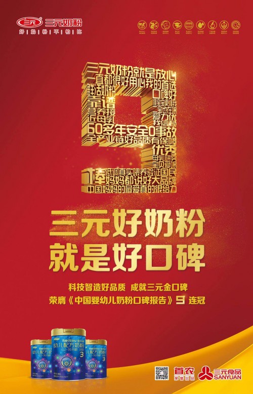 根据《2018中国品牌口碑年鉴》数据统计,凭借在消费者互动度、质量认可度、产品好评度等方面的优异成绩,三元奶粉荣登2018年度中国婴幼儿奶粉口碑榜首,实现中国好口碑九连冠!并荣获“金口碑”殊荣!