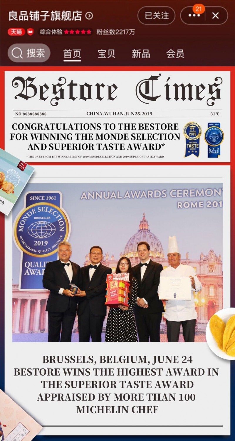 6月25日上午,很多消费者在访问良品铺子天猫、京东等电商渠道店面的页面时,突然所有的网页都切换为英文报纸版式的界面,一时不明觉厉,以为是电脑中毒。一问同事朋友,发现结果一致。问题究竟出现在哪里?等定睛一看,原来这是良品铺子通过这种方式,庆祝自己刚刚在6月获得的两大国际顶尖大奖——“蒙特奖(Monde Selection)”和“顶级美味大奖(Superior Taste Award)”。