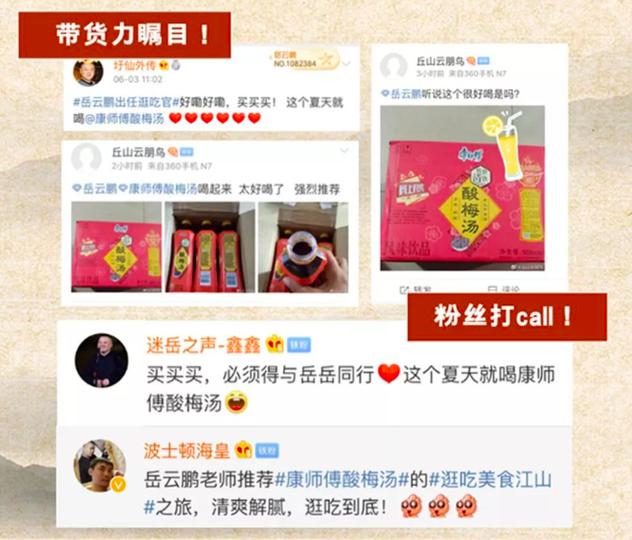 特别是“闻香食重庆“这一期,作为公认吃货的岳云鹏对战张艺兴,竟然在挑战中忍住了美食诱惑,赛后小岳岳秒破功,胡吃海喝并强势点名康师傅酸梅汤“作陪”。其实,早在6月3日,岳云鹏就已和康师傅酸梅汤牵手,成为康师傅酸梅汤首席逛吃官,其官宣微博话题一度登上微博热搜榜TOP3。同一时间,康师傅“逛吃美食江山”活动也重磅上线,这一系列的动作,着实吸睛。
