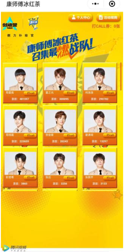在《创造营2019》中,康师傅冰红茶化身“燃力补给官”,召集燃战队。消费者通过购买康师傅冰红茶,即可直接通过康师傅冰红茶官方微信菜单栏进入活动页面,输入产品瓶盖内的13位串码,就有机会为自己pick的小哥哥打call,助其加入燃战队,成为品牌代言人之一。