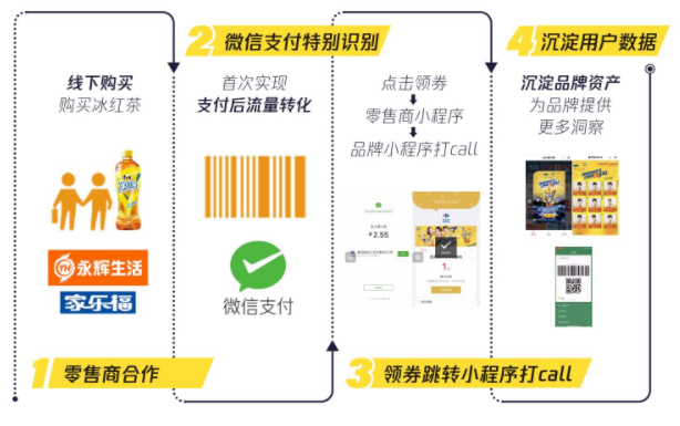 除了在线下开展票选活动外,更与国内知名零售商家乐福、永辉生活等联动,首次打通消费者从购买——微信支付——点击领券——零售商小程序——品牌打call小程序——数据沉淀的核销激励链路。只要在线下家乐福等零售平台购买康师傅冰红茶,扫码枪自动识别,微信支付后获得额外打call机会及优惠券,点击领券先跳转到家乐福等零售商小程序,接着到康师傅冰红茶打call小程序页面,完成打call并为票选代言人引流,沉淀数据资产。