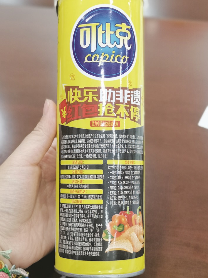另外一款黄色罐装的可比克薯片,则宣称:“达利食品集团将联合中国非物质文化遗产公益基金发起‘快乐助非遗,红包抢不停’公益行动……”该活动时间是“即日起至2018年5月31日”。