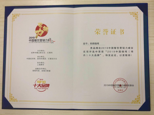 本次参与竞选的300多个竞选品牌都是实力雄厚的餐饮企业,经历25天的激烈评选,何师烧烤以83766票荣居2019年中国烧烤(烤肉)十大品牌前列,这也是业界对何师烧烤自成立以来在烧烤餐饮行业做出的价值贡献给与的肯定与鼓励!