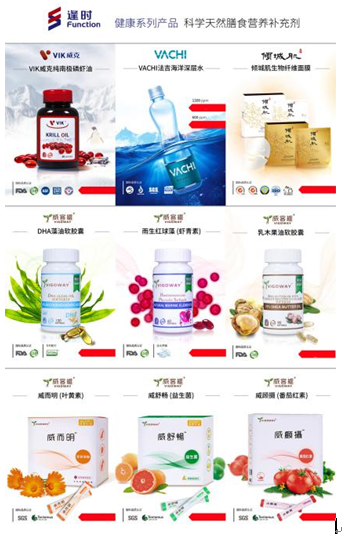 包括:清新视界的叶黄素威而明、每个女人青春靓丽都需要的雨生红球藻、关节消炎软骨修复的乳木果油、祛除口腔异味抑制幽门螺杆菌还能解酒的VACHI法吉海洋深层水、3合1助消化排便的益生菌、打造女王肌底修复专家的倾城肌面膜、孕妇婴幼儿备孕健脑的DHA、男士前列腺的卫士威顾摄等;