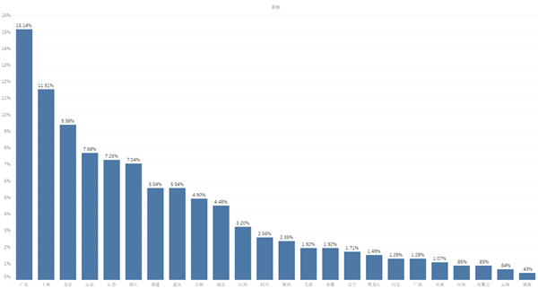 从各省(区、市)所拥有的餐饮品牌数量来看,广东省位居榜首,其次是上海和北京。结合门店数和品牌数目分析,广东、上海地区拥有较高的品牌打造能力和影响能力。