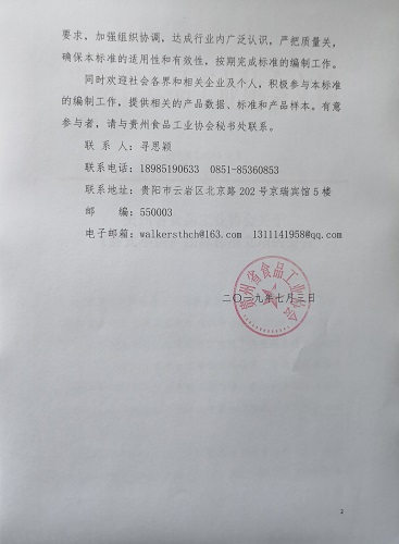 同时欢迎社会各界和相关企业及个人,积极参与本标准的编制工作,提供相关的产品数据、标准和产品样本。有意参与者,请与贵州食品工业协会秘书处联系。