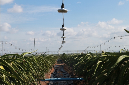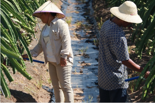 顶着太阳行走在田间,一路上尽是大片望不尽的果田,左手边是香蕉树,右手边是芒果园,再往前走,还有葡萄和蜜柚,成群的水牛在田间撒欢儿,时不时还有几只从路中间跳过,去别家的田里折腾一下,可它们从不接近那片一千亩的火龙果种植基地。