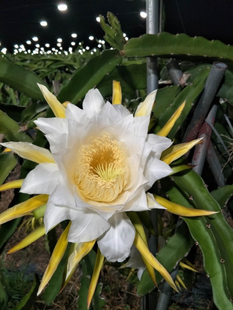 火龙果的生长要12个小时的日照时间,冬天不够,就要人工补充。每隔1.7米,果子们的头顶上就有一盏灯。而霸王花(火龙果开的花)和昙花相似,只在晚上开花,开一天便落。到了晚上8、9点钟,一排排的的霸王花像约好了时间同时盛开,夜晚安静,陈良运听得见花开的声音,那是一天里最浪漫的时刻,白花黄蕊,在一串白色的灯光下美成了一幅画。“就觉得火龙果是有生命的,我们是在跟它谈恋爱。”