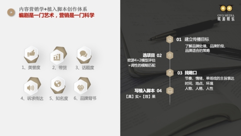 关键在于创意和诉求传达。如今社会对于广告的接纳形式已从“洗脑”转变为“种草”,所以品牌一定要具备讲好故事的能力。在影视框架下,品牌首先要找到与剧情符合的叙事情绪,其次顺应剧情节奏,在合适的剧情场景植入产品,最后根据产品的受众画像,找到与其符合的人设并绑定。欧游娱乐有一套完整的创意方法论——内容营销学+植入脚本创作体系,为品牌创意提供指导。让不同阶段,不同诉求,不同目标的品牌建立适合自己的剧本语言。