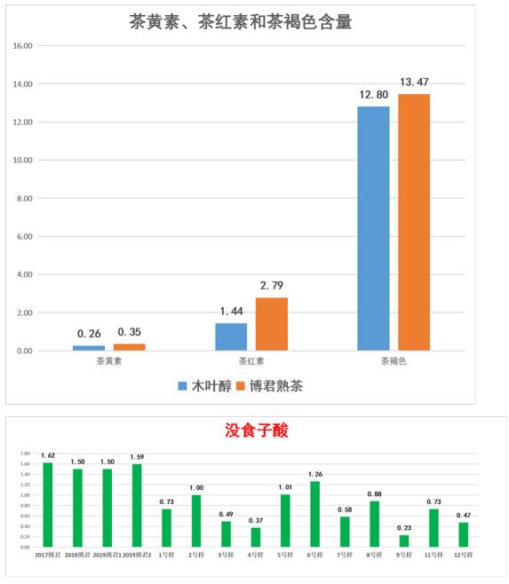博君熟茶理化指标分析,博君熟茶茶黄素(抗氧化等)、茶红素(是一种很强的抗氧化剂,能够帮助老化的机体抵抗生物氧化,效果比茶多酚类更为显著)、没食子酸(抗氧化,对肝脏有保护作用,软化血管)含量明显高于传统熟茶,特别是没食子酸的含量比传统熟茶高出230%。
