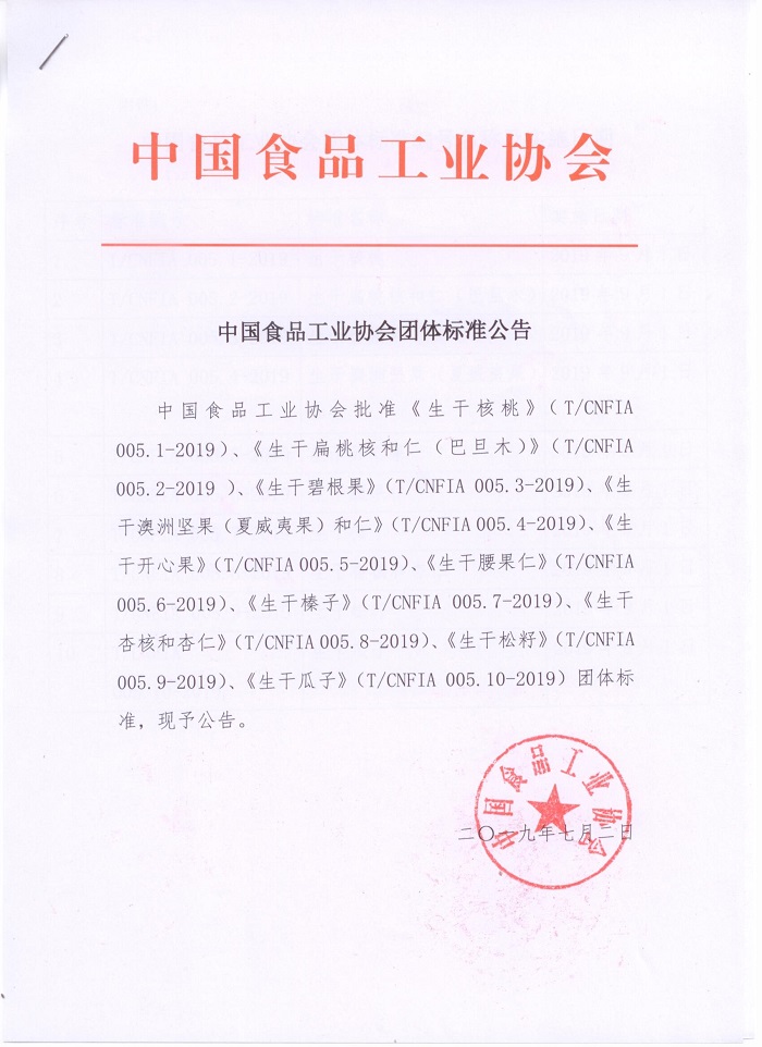 由中国食品工业协会协会组织起草制订的《坚果籽类食品质量等级》系列团体标准(T/CNFIA 005—2019),共10个产品,经中国食品工业协会批准于近期发布,并定于2019年9月1日实施。