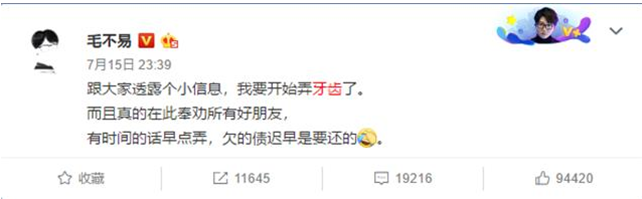 这一话题引起全桌人的赞同,统计一下整过牙的人,没想到,一桌人都举起手。是呀现在明星整容已经不见怪了,整牙更是必备的项目,牙不好,可以整,牙有缺陷也要整,即使牙还不错,也更加追求完美,追求整齐美白!还有一个牙缝小可爱毛不易,他每次说话,都清晰可见的牙缝很大,在节目里笑起时,也是包着嘴尽力笑不露齿,经常被人喊话牙齿问题,终于在微博上宣布要去弄牙齿了!
