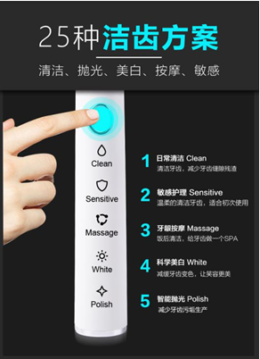 性能方面,为达成更好的清洁力,也考虑到用户的口腔问题,SU-3在频率、扭力、摆幅的黄金三角清洁理论的基础上,SU-3设计了五档工作模式(清洁、敏感、美白、按摩、抛光),每档还有五种智能力度调节,满足不同牙齿敏感度人群的需求。支持定时2分钟(保证科学及有效的刷牙时长),每隔30秒停顿(智能提醒换区刷牙),一键开关,一键调频,同时具备智能记忆功能。