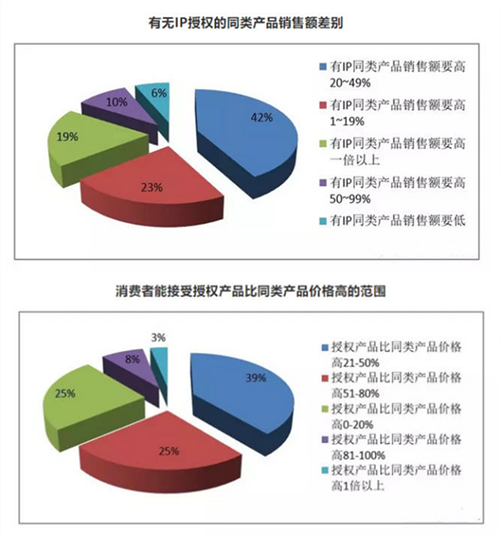 根据《2018中国品牌授权行业发展报告》显示,有94%的被授权企业表示有IP授权产品的销售额普遍都要高于其他同类产品,其中销售额超过同类产品一倍以上的接近20%。并且在对待同类产品时,消费者心理普遍能接受有IP的授权产品要比同类产品价格高,大家更愿意为了自己喜欢的IP周边去买单。