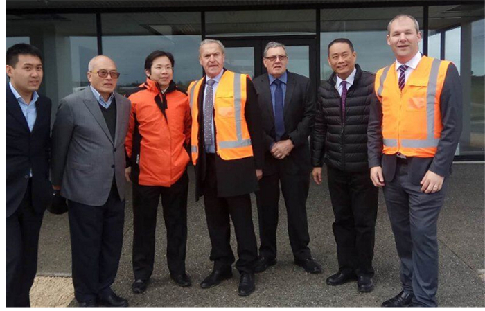 时任新西兰众议院议长David Carter(左四),国会议员Andrew falloon(右一)在参观完工厂之后与欢恩宝董事长张育建(右二)合影
