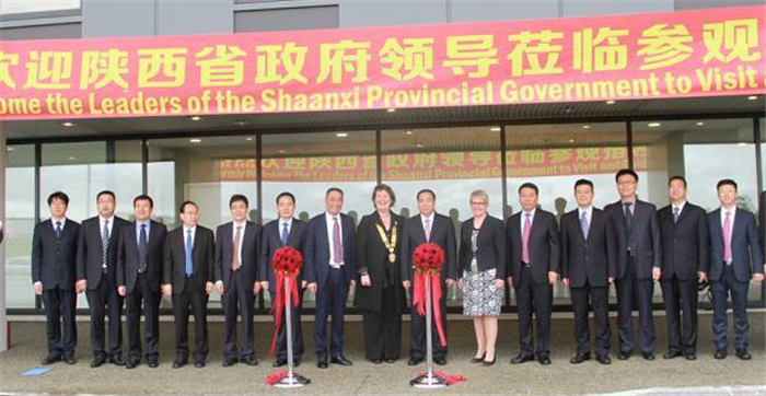 时任陕西副省长姜峰(右七)、时任新西兰国会议员Jo Coodhew(右六)、阿斯伯顿市长Donna Favel(右八)及陕西省考察团成员与欢恩宝乳业驻新西兰代表合影)