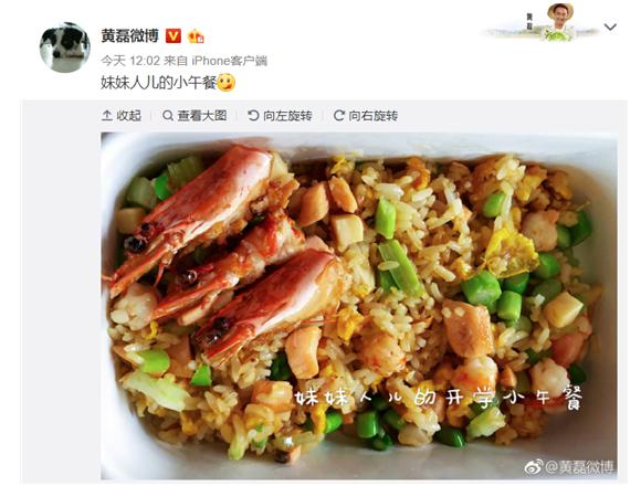 同样用美食表达爱意的还有“黄小厨”,这么多年来他为妻子和两个宝贝女儿亲自下厨,厨艺了得。孙莉曾说过,怀孕时比孕前重了60斤,因为黄磊太能做好吃的了,早中晚三餐饭不重样。黄磊经常在微博上晒美食,为两个女儿做的爱心午餐让无数人垂涎欲滴。
