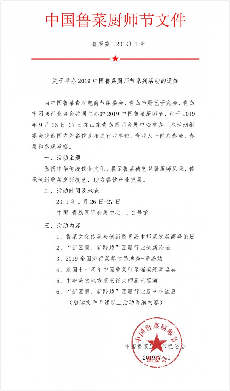 由中国鲁菜食材电商节组委会、青岛市厨艺研究会、青岛市团膳行业协会共同主办的 2019中国鲁菜厨师节,将于2019年9月26日-27日在山东·青岛国际会展中心1、2号馆举行。