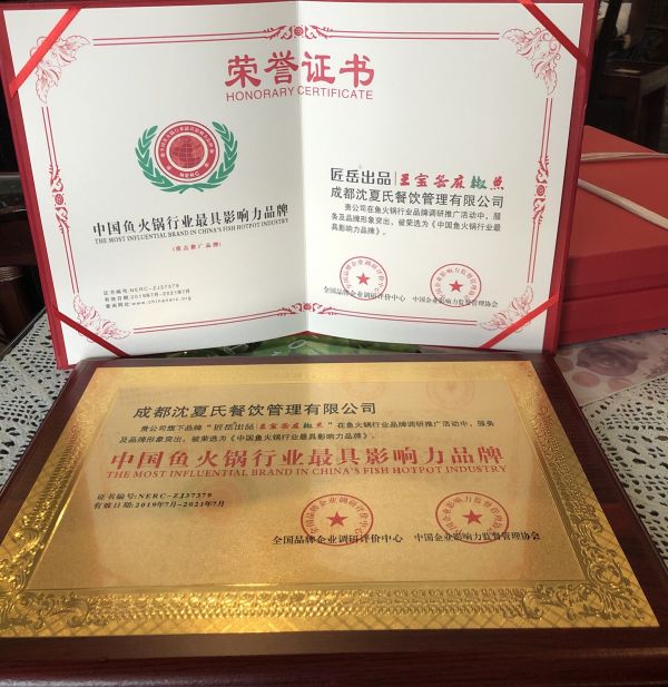 2019年7月5日,全国品牌企业调研评价中心和中轻业产品质量检验协会联合在北京举办了中国火锅行业特色连锁品牌评选活动,在本次活动中依据全国品牌企业调研评价中心《行业影响力品牌评定标准》,由该中心多位行业资深专家初审后,经组织专家考察评审,结合大量市场数据,从全国参选的数十家鱼火锅品牌中评选成都沈夏氏餐饮管理有限公司匠岳出品“王宝器麻椒鱼”火锅为“中国鱼火锅行业最具影响力品牌”荣誉称号,现场进行公示,并颁发牌证。