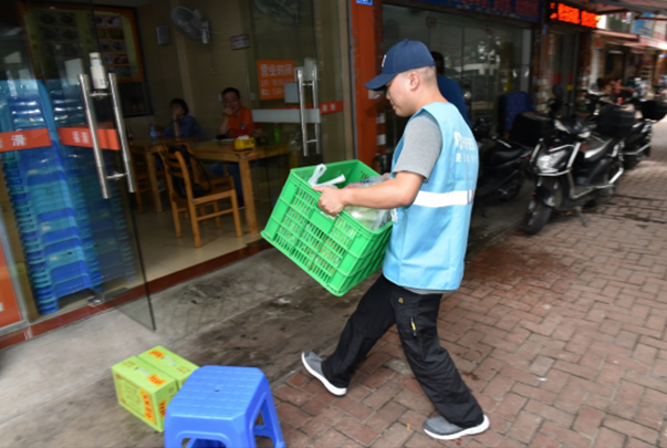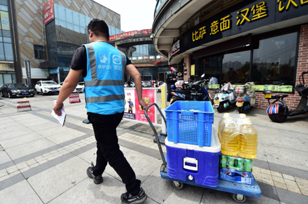 图为美团快驴进货配送员将食材准时送至福清滑餐饮店