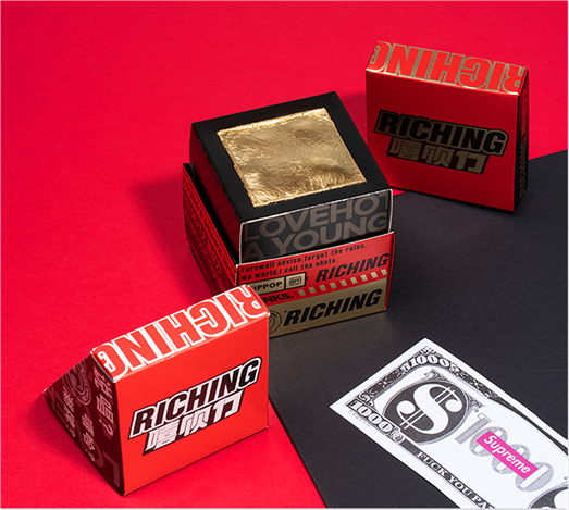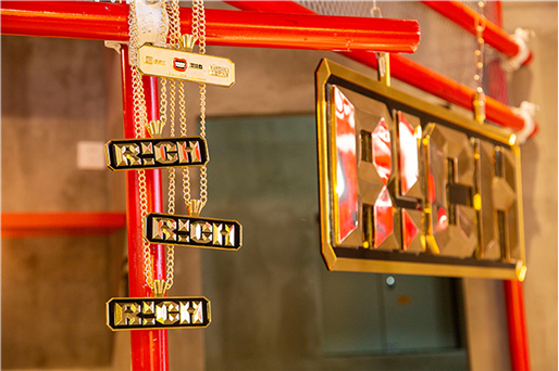 店铺的装修风格结合了《中国新说唱》里所能看到的元素,巨型的导师海报,超大的荧幕播放着节目《中国新说唱》。顶上是炫酷的霓虹灯,大片的嘻哈涂鸦,还有RICH的项链,简直就是进入到了嘻哈的battle现场。除了这些,“嘻饮力”店铺的设计大胆的采用了撞色的设计,吸引了逛街路过的潮人摆拍,在这里随便一个场景拍照都特别的上镜。