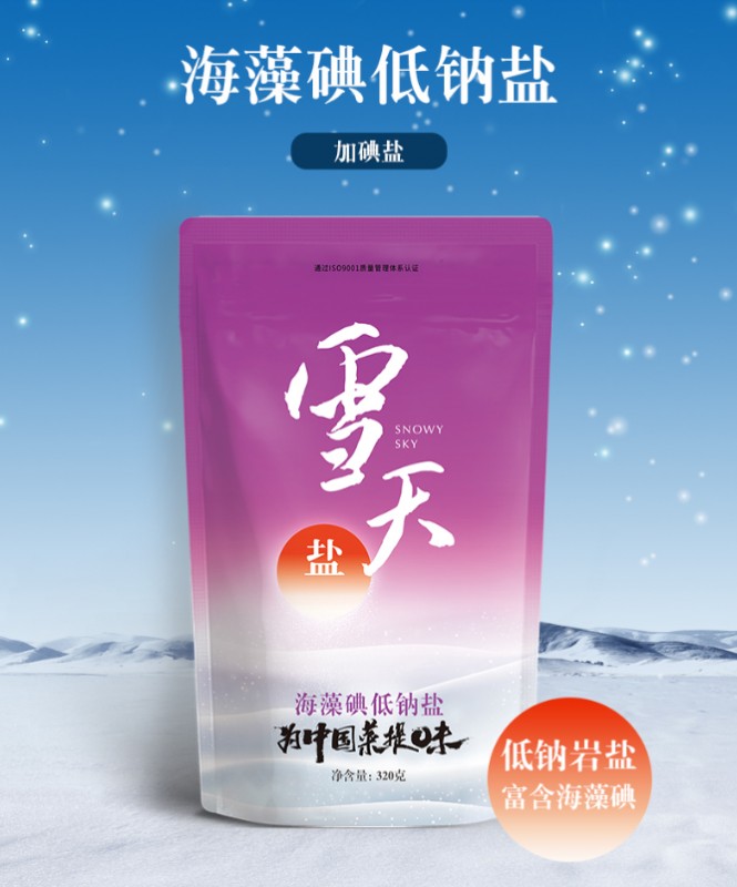 其中,雪天海藻碘低钠盐以天然岩盐为原料,添加从海藻中提取的自然碘,并配以一定量的钾元素以保持人体内电解质的平衡,具有平衡营养、减少钠离子摄入、天然健康的特点。