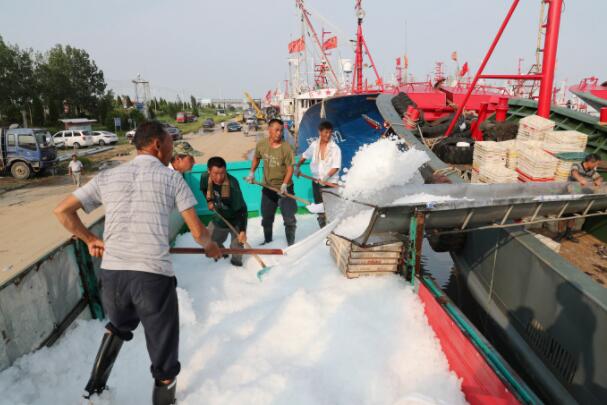 7月29日,在江苏省连云港市赣榆区青口港渔业码头渔民往渔船上添加保鲜冰块。