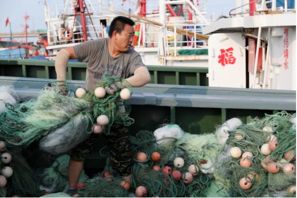 7月29日,在江苏省连云港市赣榆区青口港渔业码头,渔民在船上整理捕捞用具。