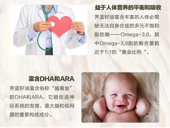 最近一款源自加拿大产区的的加美利娜荠蓝籽油就受到了众多宝妈的追捧,因为荠蓝籽油富含珍贵的omega3,6,9多元不饱和脂肪酸,omega3中又含有丰富的DHA和ARA,DHA俗称“脑黄金”,能促进神经系统的发育,是大脑和视网膜的重要构成成分,对胎儿、婴幼儿和儿童的智力和视力发展起了决定性作用,每日食用荠蓝籽油,在避免孩子过度摄取饱和脂肪酸的同时,让孩子赢在起跑线上。