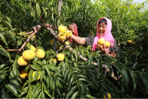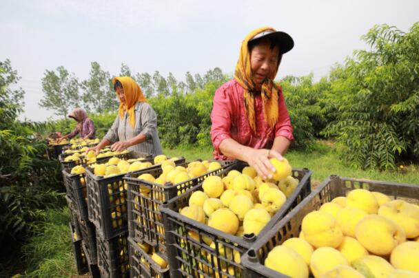 核心提示: 8月1日,江苏省连云港市赣榆区石桥镇黄桃基地果农在采摘黄桃。 8月1日,江苏省连云港市赣榆区石桥镇黄桃基地果农