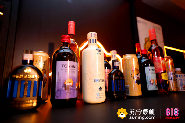 在展出的苏格拉宁联名款产品中,酒水类产品占了很大比重。据苏宁易购酒类经营中心总经理王剑介绍。近年来,90后人群酒类消费增长趋势显著,女性购酒人群占比也日益增高,他们中很多人都更加偏爱啤酒、预调酒这些酒精度数相对较低的酒,但随着白酒品牌的年轻化、时尚化发展,江小白等小酒市场也逐渐崛起。
