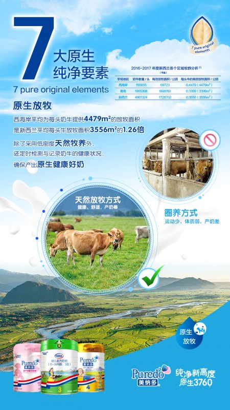 处于该纬度的新西兰西海岸拥有得天独厚的纯净生态,洁净空气、纯净水源、肥沃土壤与四季温润的海洋性气候,都是新西兰乳品优越品质的保障。据悉,新西兰全国90%的乳产品都供应出口,乳品贸易量占世界乳品贸易量的30%,这一切都是新西兰奶源的功劳。美纳多品牌旗下奶粉:美纳多婴幼儿配方奶粉、美纳多启活4段儿童配方奶粉的奶源就坐落于此。