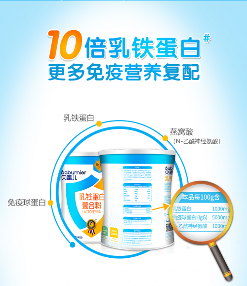 注:10倍乳铁蛋白:贝蜜儿乳铁蛋白复合粉(极钻)同贝蜜儿其他规格乳铁蛋白产品对比,1000mg/100g:100mg/100g=10:1