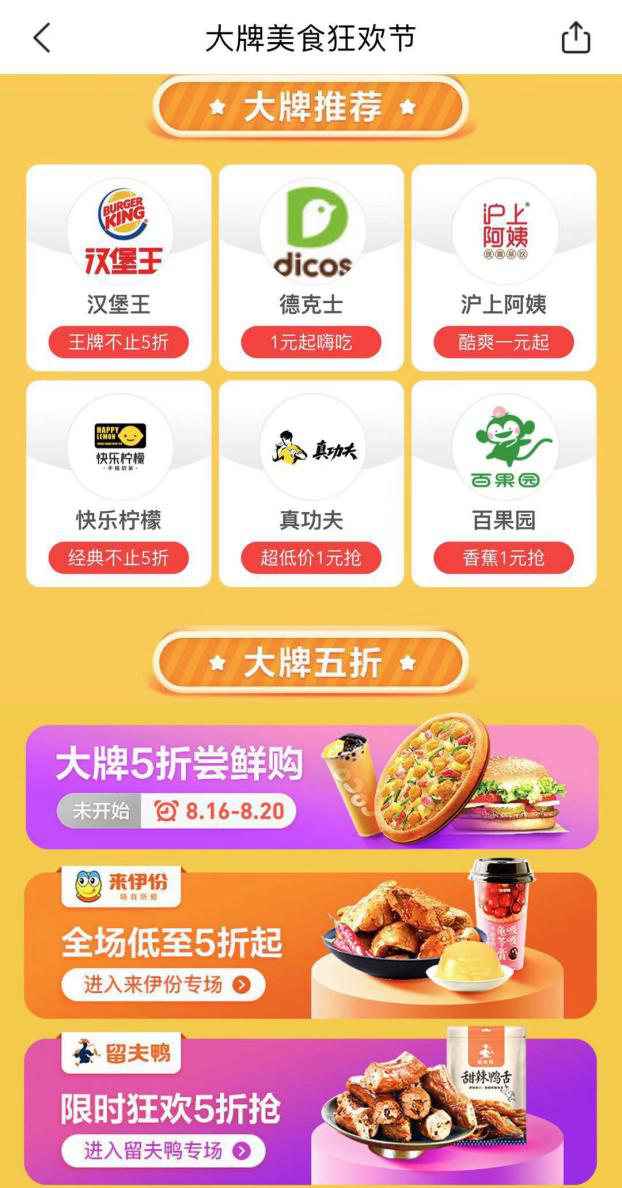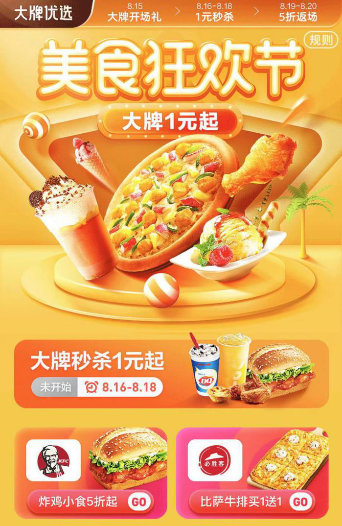 8月16日到18日,在活动第一周“尝鲜周”的周末,消费者在此期间可以享受到冰淇淋、饮品、小吃、零食等夏季热门品类的1元秒杀、大牌5折和招牌菜品等指定优惠;8月24日到25日,在活动第二周“狂欢周”的周末,各大品牌美食将在此期间推出人气爆款单品或套餐,品质产品尽享五折。