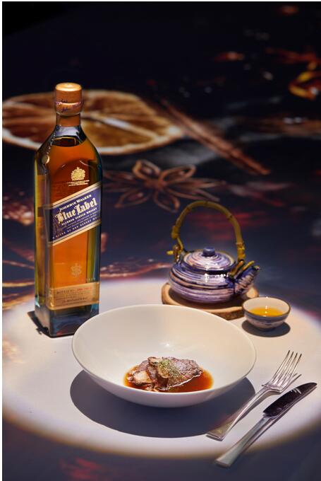 当珍稀美味遇到来自苏格兰的经典臻酿,一场舌尖上的中西交融之旅就此展开。在【稀世白龙踏彩云】菜品中,白鳟鱼的细嫩咸香,调引出蓝牌中皮蒂维克酒厂酒液的甜美果香风味,在舌尖上呈现难以复制的臻稀体验。随即,第二道菜品【海珍之冠披翡翠】奇妙尊呈,用新鲜鲍鱼的弹嫩口感,衬托出蓝牌基酒中布朗拉原酒的蜡质感。而【木香双绝佐茶韵】菜品中的澳洲M9+冠军和牛,被主厨搭配以野生松茸,令蓝牌基酒中波特艾伦的烟熏味萦绕舌尖,诠释味蕾上的平衡之妙。