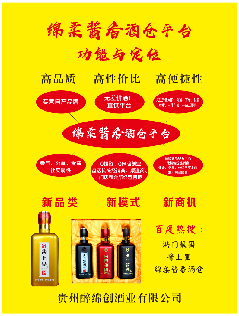 “绵柔酱香酒仓”,其字面可以看出三层新义,一是绵柔酱香型酒的新品类;二是厂家酒仓直供新平台;三是新品类、新平台、直供新模式。经百度搜索查询,绵柔酱香一词出自于《绵柔酱香——酱香白酒发展的新时代》一篇论文中,该论文首刊在《中国食品报》上,后有国内十余家媒体进行转载。该文是中国绵柔酱香型白酒创始人马金营先生,在调研中国酱香白酒的市场占比、产业布局、制约酱酒发展因素的基础上,带领研发团队,深入酱酒主产区,深耕传统酱酒酿造工艺,分析对比查找影响酱香酒口感的形成因素,采用新材料、新技术、新工艺、新方法,有效祛除“暴、烈、冲、呛”的形成因子,从而使酒体变得更纯净,入口更绵柔,酱香浓郁,回味长久,醒酒更快,在不降低酒精度53º度的情况下,饮用更安全。对这种工艺酿造出来的酱香酒确定为绵柔酱香型白酒。这种工艺从根本上解决了酱酒不易入口的问题,开创了一个新型,为酱酒的大发展,找到了新的突破口,堪称酱酒时代的里程碑,具有划时代的意义。系列产品洪门报国酒、酱上皇酒分别荣获2018中国经济年度峰会宴会指定用酒、2019中非之夜文艺春晚指定用酒、2019第六届中国品牌影响力评价成果发布会晚宴指定用酒、纪念林则徐虎门销烟180周年世界华人华侨宴会用酒等等。绵柔酱香卓越的品质早已香漂四海,醉撼九州……