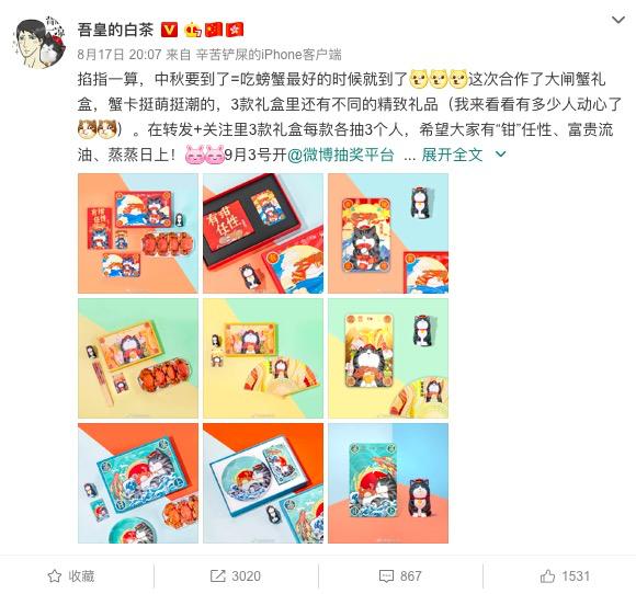 礼盒蟹卡自身极高的性价比和限量收藏价值,加上联名合作流量IP在视觉印象和产品内容等多方面的精心策划,以及胡可、王祖蓝等多位合作品牌代言明星和KOL在各大社交媒体上的联合发声助阵,使得这两大系列主题的天猫生鲜联名礼盒蟹卡,成为了此次天猫“蟹卡”热的亮点高光。