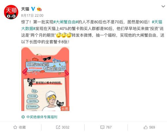 事实上,90后率先以投资收益的眼光看待“蟹卡”消费,并怀抱“大闸蟹自由”的愿景付诸实践,是天猫正在呈现的一种颇具社会观察意义的年轻态消费观。
